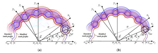 To guarantee the reasonable clearances, four types of the tooth profile modification (TPM) [5] are proposed by means of changing and accordingly in Equation (1), as shown in Figure 3a,b, respectively. Hence, the general equation of four modified profiles can be rewritten as: