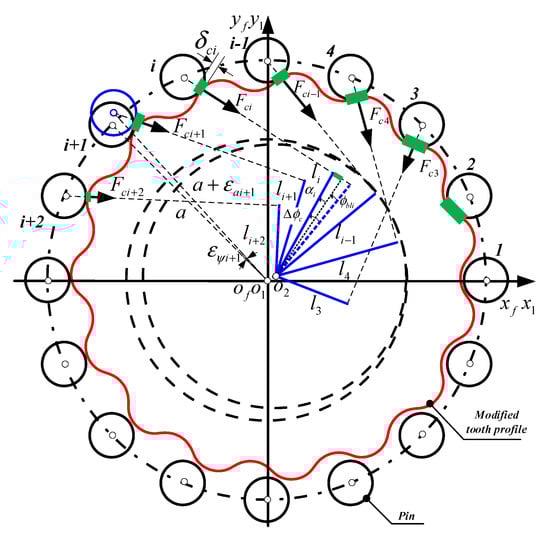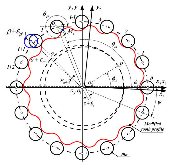 The current load distribution model of the cycloid-pin gear pair is based on the assumption of the theoretical positions of ring pins [3,24,25,28,29]. This model lacks the ability to include the deviations effect accurately, which is caused by manufacturing errors and elastic deformations, and fails to agree with the practical property of the gear mesh process.