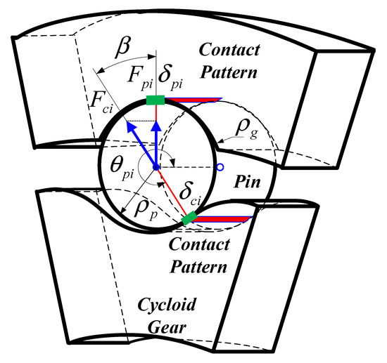 where , , and stand for the elasticity modulus, Poisson’s ratio, and curvature radius, respectively. Subscripts p, c, and g stand for the pins, cycloid gear teeth, and pin-grooves, respecitvely.