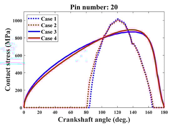 Figure 9 shows the variations of the time-varying contact stress over the tooth profile corresponding to pin number 20 for the four cases. It can be noted that the contact length decreases dramatically when the TPM is considered in Case 1 and Case 2. Comparing Case 1 with Case 3, the maximum contact stress of the cycloid-pin pairs increases from about 868 MPa to 1017 MPa due to the increasing loads on a single tooth pair, as shown in Figure 8. Because of the contact deformation of pin-groove pairs, for Case 2 and Case 4, the magnitudes of maximum contact stress are a little bit higher than those for Case 1 and Case 3.