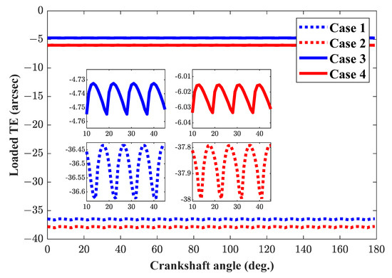 Figure 10 shows the comparison of the loaded TE within one mesh circle for four cases. It is observed that, for four cases, the loaded TE curves are periodical, continuous, quasi-sinusoid, and parabolic curves. For Case 3 and Case 4, without TPM, the mean and peak-to-peak values of the loaded TE are −4.745 arc seconds, 0.022 arc seconds, −6.023 arc seconds, and 0.018 arc seconds, respectively. When the TPM is present for Case 1 and Case 2, both the mean and peak-to-peak values of the loaded TE increase due to the increase in meshing clearances, as expected. For Case 2 and Case 4, considering the contact deformation of pin-groove pairs, the absolute mean values and magnitudes are larger than those for Case 1 and Case 3. It can be concluded that the comparison results obtained by the proposed model show a good agreement with those predicted by the current model, which could verify the correctness of the proposed model. The effects of the contact deformation of pin-groove pairs on the distributed load, contact stress, and loaded TE can also be seen, which should be taken seriously in the design stage.