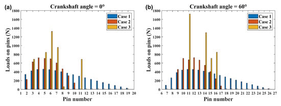 Comparison of the load distribution on ring pins at (a) 0°, (b) 60°, (c) 120°, and (d) 180° crankshaft angles for three cases.