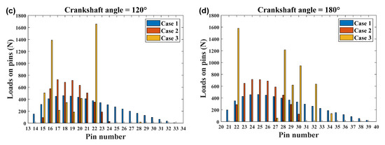 Comparison of the loads distributed among pins and pin-grooves at (a) 0°, (b) 60°, (c) 120°, and (d) 180° crankshaft angles for four cases.
