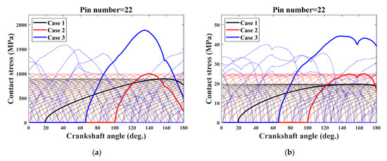 Figure 13 shows the effects of the random position errors on the time-varying Hertzian contact stress on all the pins and also on the corresponding pin-grooves. It can be seen that, for Case 3, the variations of the Hertzian contact stress show many abrupt changes, and the highest magnitude is on pin number 22. Comparing Figure 13a with Figure 13b, due to concavo-convex contact characteristic, the maximum contact stress between the pins and the corresponding teeth (1887 MPa) is much higher than that between the pins and the corresponding pin-grooves (44 MPa), which may exceed the allowable stress of the material used, leading to pitting failure on the gear tooth surfaces. In the improved model, the influence of damaging will be negligible. With this assumption, the proposed model can be used to predict whether the failure happens with the stress values to avoid the uncertainness of the damage when the stress is beyond the allowable value.
