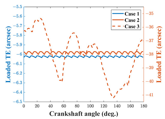 Figure 14 shows the comparisons of the loaded TE for three cases. It is observed that, for Case 1 and Case 2, the loaded TE shows a periodical change as the crankshaft rotates. The mean values are −6.023 arc seconds and −37.89 arc seconds, as expected. Their peak-to-peak values are 0.018 arc seconds and 0.21 arc-seconds. For Case 3, the loaded TE is an irregular curve, and both the mean and peak-to-peak values change significantly to −38.26 arc seconds and 5.83 arc-seconds due to the random angular position errors and radial position errors. It can be concluded that the position deviations of ring pins have a significant influence on the loaded TE of the cycloid-pin gear pair, leading in turn to instability and a reduction in the positioning accuracy of the RV speed reducers.