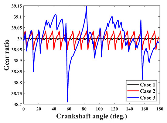 Comparisons of the instantaneous gear ratio for three cases.