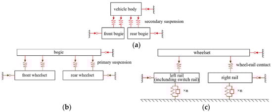 In a railway line, there are usually multiple tracks in the switch area where the wheel–rail relationship is more complex. The turnout system is often studied as the weak link of the track, which plays a controlling role in the passing capacity. When the wheelset passes through the switch rail section, the wheel–rail system will produce a drastic lateral impact because the flange root of the outer wheel inevitably touches and impacts the switch rail, thus causing the lateral force of the outer wheel–rail to increase suddenly [1,2]. When the train enters the turnout in reverse direction, the lateral acceleration of the vehicle body in the switch rail section controls the riding quality [3]. The wheel–rail lateral impact is dominant in this area [4,5].