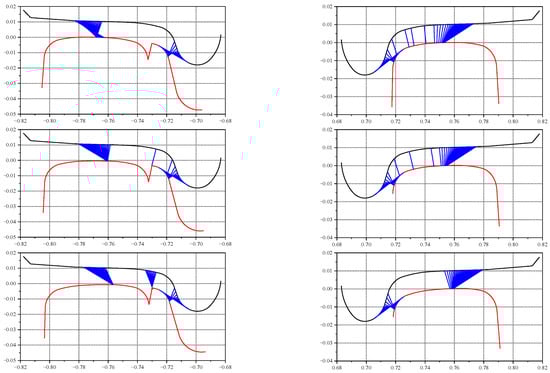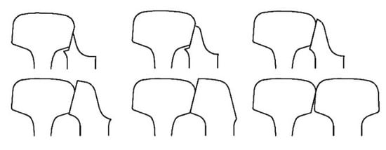 Because of the existence of the switch rail structure, the outer rail of the guide curve has a variable cross-section within a certain length range. In order to model the rail with variable sections, taking 1:42 turnout as an example, 12 sections are selected in its length range. Six of these sections are shown in Figure 2. Using the unified coordinate system, the outer contour of each selected section is discretized into a series of separate points. Its coordinates are then written into the section files according to the required program language rules. Then, the rail with variable cross-sections can be formed by the interpolation algorithm. The Bézier curve is used in the interpolation, and n + 1 control points can determine an n-th order Bézier curve [29,30]. It is described as follows: