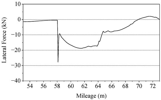 We set the vehicle of the model to pass through the diverging route of the turnout at a speed of 160 km/h, and calculated the wheel–rail lateral force of the forepart of the curved switch rail. Taking the calculation results of the first wheelset, the typical calculation condition of the wheel–rail lateral force of the outer rail is shown in Figure 3.