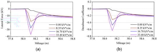 Wheel–rail lateral force and derailment coefficient under different lateral damping. (a) lateral force; (b) derailment coefficient.