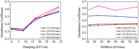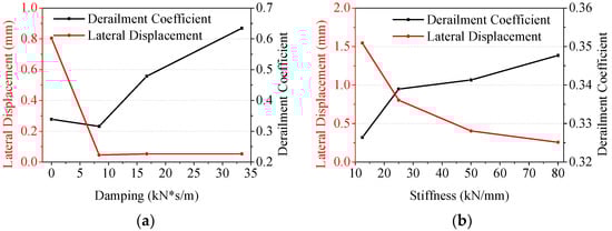 In terms of the calculation results, if we leave out the undamped condition, the increase in lateral damping will increase the derailment coefficient, while the stiffness change has no obvious influence on it. In engineering practice, adjusting the track damping can usually be achieved by changing the structure of the fasteners. For example, under-rail pads of different materials can affect the dynamic characteristics of the track [35].