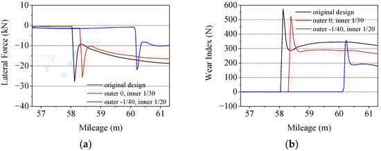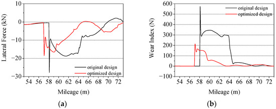 where and are the longitudinal and lateral creep forces between the wheel and rail, respectively; and are the longitudinal and lateral creep rates, respectively; and is the spin creep force and is the spin creep rate. The calculation results under different working conditions are shown in Figure 9b. It can be seen that the optimized design affected the wear between the wheel and rail. The peak value of the wear index can be reduced by 38.3%, which effectively alleviates the severity of wear.