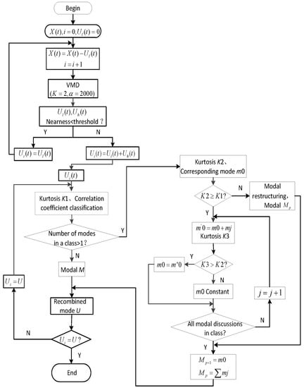 - Modal reorganization determination. On the basis of the kurtosis, the reorganization of the class with more than one mode is determined and the maximum kurtosis S of modes in the class is compared with the value of kurtosis . When , the modal classification in the class is considered to be dominated by noise, the modal reorganization in the class. When , all modalities in the class are combined with corresponding modalities , respectively, and, based on the above principle, the decision is made whether to reorganize or not. Finally, all modalities are outputted after regrouping.