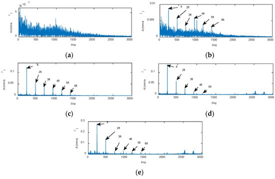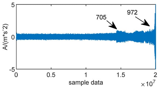 - The original vibration signal is decomposed using the improved VMD method, and modalities selected by the weighted kurtosis index are demodulated via enveloping with evident filtering effect. This effect is beneficial for separating early fault characteristics from the disturbance noise and conducive to the extraction of feature indicators.