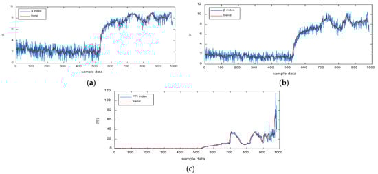 - Iteration stop judgment. Stop the iteration when the posting progress of central frequencies of the two modes obtained from the decomposition is less than the set threshold to obtain the final decomposed mode. The posting progress is defined as follows:where and represent the posting progress of center frequencies of modes and , respectively. Step (2) is performed when is less than the set threshold; otherwise, the sum of all low- and high-frequency modes is calculated. Finally, all modes are outputted .