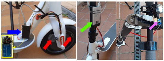 The blue arrow indicates the box (4 cm × 7 cm) that contained the Arduino, SD reader, and accelerometer (ADXL335), which was fixed by screwing it directly to the chassis of the scooter with an M3 screw placed at the yellow ring location indicated in Figure 3. The red arrow on the left points to the 49E auto-switch, and the one on the right points to the magnet attached to the wheel. The green arrow indicates the position of the lithium battery that powered the system, and the purple arrow shows the switch and LEDs that indicated the data-recording process.