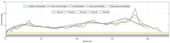 For example, to visualise how the choice of this time constant varied, the scenario of pavement A, Driver 02, second replica was collected. Figure 11 shows the decrease in the maximum values as the calculation time of the comfort value increased, also lowering its sensitivity for detecting short-duration events.