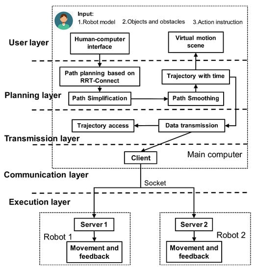 In order to solve the problem of trajectory planning in the process of dual-robot cooperative assembly, a theoretical hierarchical framework for dual-robot cooperative trajectory planning is designed. As shown in Figure 2, it is divided into 5 layers, from top to bottom including user layer, planning layer, transmission layer, communication layer, and execution layer.