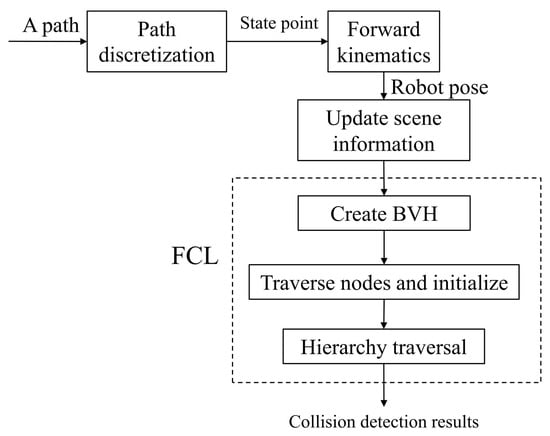 In the system, the Flexible Collision Library (FCL) [32] is used to realize the collision detection of each point. The flow of collision detection is shown in Figure 5.