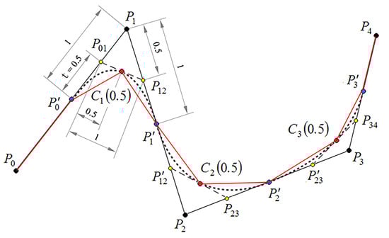 Equation (5) shows that the point of quadratic Bezier curve is a point on line segment , and satisfies the following proportional relationship [34]: