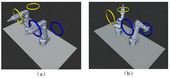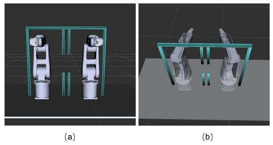 In order to further test the ability of the method proposed in this paper to carry out the dual-robot motion planning, we compare other algorithms using the publicly available Open Motion Planning Library (OMPL) [36] implementations. In addition, on the basis of Figure 7 (Scenario 1), the scene shown in Figure 13 (Scenario 2) is set up in RViz to conduct experiments. In this figure, the cyan door-shaped frame is an obstacle, and a gap of 200 mm high is left in the middle of the obstacle. The dual-robot will move from the starting position in Figure 14a to the other side of the door-shaped obstacle in Figure 14b. Compared with Figure 7, the two arms must pass through the gap one after the other to achieve collision-free motion in this scenario. The emphasis on trajectory planning in the dynamic interference of two arms increases the difficulty of algorithm solving.