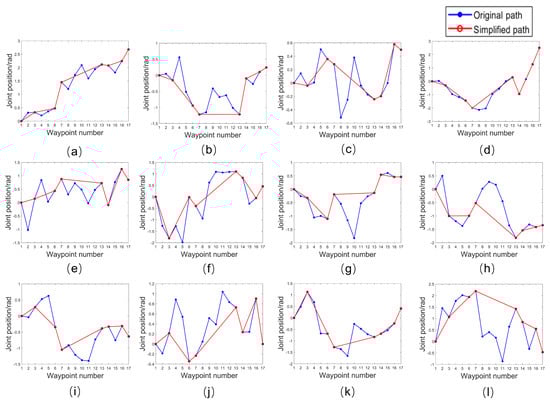 Comparison of original path and simplified path of each joint. (a–f) Positions of the left robot joint 1–6. (g–l) Positions of the right robot joint 1–6.