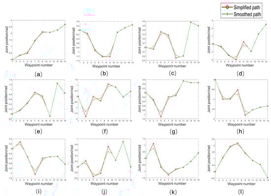 Comparison of simplified path and smoothed path of each joint. (a–f) Positions of the left robot joint 1–6. (g–l) Positions of the right robot joint 1–6.