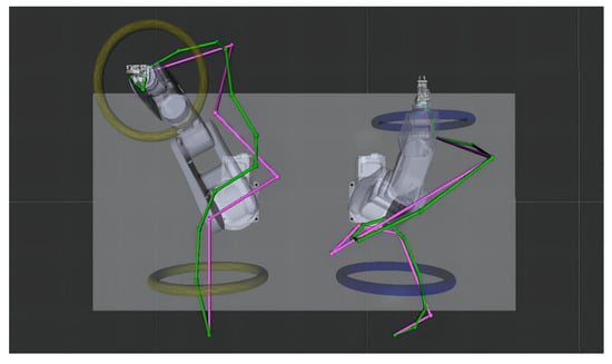 In the third set of actions, the left robot places the wire from to . There is no need to place the object in a specified direction, so the approach vector is set to . In addition, then the left robot moves along the vector after placing the object. The action of the right robot is the same, and the whole process of disassembling terminal with wire is finally finished.