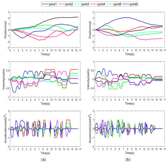 According to Equation (8), the shorter the time interval , the greater the acceleration. To limit the acceleration in a certain range, it is necessary to increase or . At the same time, the acceleration of each joint can be recursive, i can be recursive from 1 to n to obtain the acceleration in the path, and can also be recursive from n to 1 to obtain the deceleration in the path.