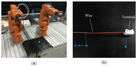 In order to test whether the dual-robot can complete a task using the planned trajectory, an experiment was designed for the dual-robot to cooperate to disassemble terminal with Wire. The experimental scene is shown in Figure 14. The red wire is inserted in the terminal. The part of the wire buried in the socket is clamped inside the terminal. In order to separate the wire from the terminal, the button on the terminal needs to be pressed to loosen the socket, while the wire should be pulled out at the same time.