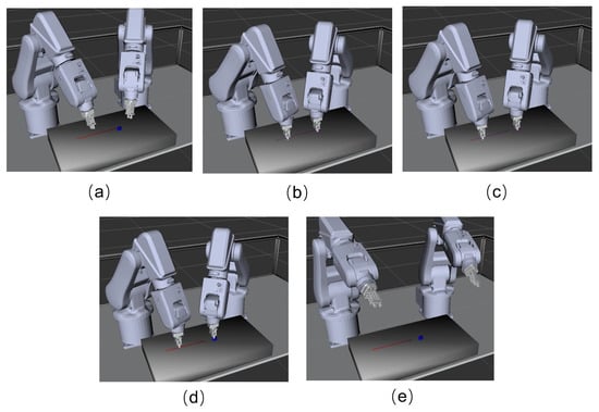 Task simulation in RViz. (a) Dual-robot approaches grasping points. (b) Dual-robot grabs object. (c) Left robot pulls out the wire. (d) Dual-robot puts down the object. (e) Dual-robot returns to the origin.