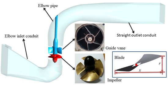 Taking the vertical axial-flow pump as the research object, the calculation domain includes elbow inlet conduit, impeller, guide vane, and straight outlet conduit. The three-dimensional model of the vertical axial-flow pump device is shown in Figure 2, the impeller model is ZM55, the impeller’s nominal diameter is 120 mm, the hub ratio is 0.40, the blade number is 4, and the blade placement angle is 0°. The three-dimensional geometry of the blade was determined according to the design parameters of the axial-flow pump impeller, as shown in the schematic diagram in Figure 2. When the horizontal length x of the blade is 0.54D and the height difference r between the outer edge of the blade outlet and the outer edge of the inlet edge is 0.17D, it is defined that the position of the blade at the hub center at this time is 0°. The average clearance of the tip is 0.2 mm, and the guide vane blade number is 5. The outlet conduit is a straight pipe structure, the equivalent diffusion angle is 2.41°, the inlet is circular, the outlet is rectangular, and the conduit profile changes evenly. The cross-sectional area at the outlet of elbow inlet conduit is 113 cm2, and the cross-sectional area at the inlet of straight outlet conduit is 154 cm2. Figure 3a shows the geometric dimension of the elbow inlet conduit, Figure 3b shows the geometric dimension of the straight outlet conduit, and D in the figure is the nominal diameter of the impeller.