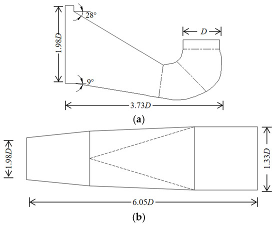 Geometric dimension of the flow conduit. (a) Geometric dimension drawing of the elbow inlet conduit. (b) Geometric dimension drawing of the straight outlet conduit.