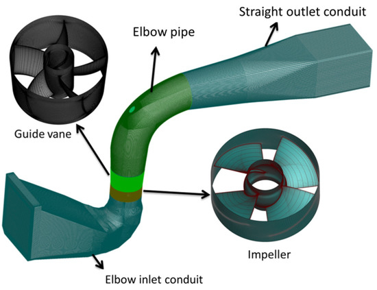 Turbogrid was used for structural grid division of the impeller and guide vane, and ICEM software was used for structural grid division of the elbow inlet conduit, elbow, and straight outlet conduit, as shown in Figure 4. After the grid division process was completed, the grid around the blade was densified. Because the precision of the grid plays a decisive role in the accuracy and efficiency of numerical calculation, especially the grid quality of boundary layer near the wall, in order to describe the boundary layer flow in the near wall region, the dimensionless parameter y+ was introduced to represent the distance from the nearest grid node to the wall. It is necessary to consider a reasonable value of y+ to meet the requirement of the SST k-ω turbulence model on the quality of near wall grid, the y+ value in most areas of the impeller blade and guide vane were within 30, the specific definitions of y+ are as follows [34]: