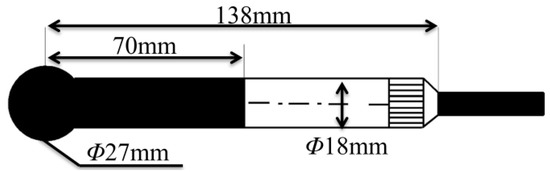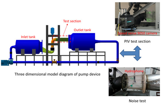 The noise test of the vertical axial-flow pump device was tested on the Φ120 mm hydraulic mechanical closed cycle test bed of the Jiangsu Provincial Key Laboratory of Water Conservancy and Power Engineering. The impeller is made of brass material, the guide vane is made of stainless steel metal material, and the elbow inlet conduit and the straight outlet conduit are all made of transparent plexiglass. The LDG-125S-92 electromagnetic flowmeter was used for flow measurement, the EJA intelligent differential pressure transmitter was used for lift measurement, and the JCO type 0.1 rotational speed torque sensor was used for torque and rotation speed measurement. Because the accuracy of the noise measurement results is closely related to the installation position of the hydrophone, in order to ensure the measurement accuracy, the transmitting transducer should face the test direction of the receiving hydrophone, and the transducer and the center of the hydrophone should be kept at the same depth, the hydrophone was arranged vertically at the midpoint of the middle part of the straight outlet conduit, the hydrophone in the noise test adopted the RHS-20 standard hydrophone, and the signal adopted the TST6200 dynamic signal acquisition system. The RHS-20 standard hydrophone has no directivity in the horizontal plane and no directivity in the range of 240° in the vertical plane, its frequency range can cover most of the underwater acoustic measurement frequency bands. In the frequency range of 20 Hz to 80 kHz, the receiving sensitivity response is flat, and it is suitable for long-distance signal transmission, the appearance size of the hydrophone is shown in Figure 5. Using the 2D3C-PIV test system, the instantaneous flow field of the vertical axial-flow pump device in the structural change section of the straight outlet conduit was measured, and the numerical calculation results of the flow field in the pump device were verified. Wait for the pump device to run stably for 5 min, after that, start the PIV laser test, inject clean water into the transparent rectangular water tank outside the straight outlet conduit test section as shown in Figure 6, and keep no obvious air bubbles and large stains. Because the test area is small, the 2D2C test accuracy is sufficient to meet the test requirements [36]. The 2D3C-PIV test system mainly includes a dual-cavity Nd: Yag laser with a maximum output energy of 600 mJ, a wavelength of 532 nm, a maximum frequency of 100 Hz, and a pulse duration of 6 ns. The resolution of the Speed sense 9050 camera is 2400 × 1800 pixels, and the acquisition speed is 480 frames/s. The tracer particles are made of polystyrene, with a density close to that of water, good follow-up to fluid movement, and uniform distribution in water. By comparing the displacement changes of the tracer particles in the two images with time interval, the Vx and Vz of the water flow can be obtained, that is, the instantaneous velocity of the water flow velocity in the lateral and axial directions. The PIV test and the noise test of the straight outlet conduit are shown in Figure 6.