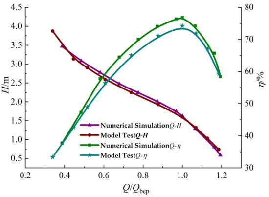The external characteristic data of the vertical axial-flow pump device at 2200 r/min under different flow rate conditions were obtained through steady-state calculation. At the same time, the energy performance test of the pump device was completed in Jiangsu Key Laboratory of Hydraulic and Power Engineering. In order to better compare and analyze the numerical prediction and model test results, the flow rate Qbep at the optimal operating point was taken as the benchmark, and the ratio of the flow rate Q at the non-optimal operating point to the flow rate Qbep at the optimal operating point was taken as the coefficient, i.e., Q/Qbep. As shown in Figure 7, the Q-H curve fitted by the numerical calculation results was compared with the test data, the change trend of the predicted performance curve of the pump device was basically consistent with the test curve, and the curve was in good agreement. When less than 0.6Qbep, the Q-H curve of numerical calculation was slightly higher than that of the physical model test. Near 1.0Qbep, the Q-H curve of numerical calculation basically coincided with the Q-H curve of the physical model test. When it was greater than 0.5Qbep, the Q-η curve of numerical calculation was higher than that of the physical model test. At 1.0Qbep, the absolute error of efficiency between numerical calculation and the model test was 2.6%, and the absolute error of each point was less than 3%. The numerical calculation was in good agreement with the model test. In this paper, the flow corresponding to 0.6 times the optimal working condition at each speed (0.6Qbep) was used to analyze the influence of rotation speed on the internal flow field and hydraulic noise in the conduit.