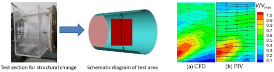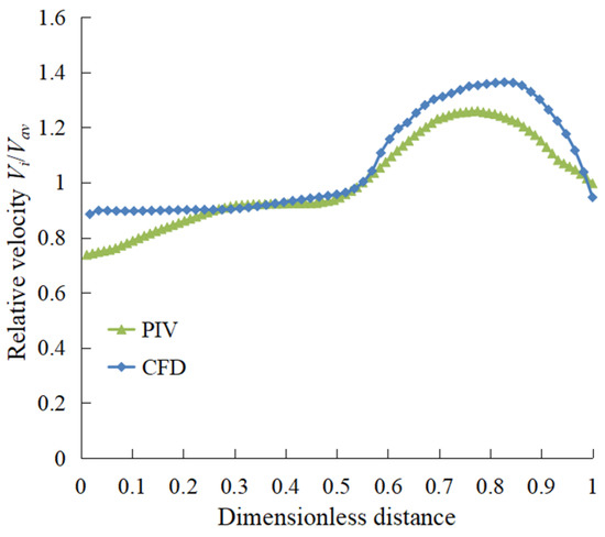 The structure change test section and test area of the straight outlet conduit are shown in Figure 8, a measuring line A-A of the section of the test area was intercepted, the relative velocity was compared, and the comparison results are shown in Figure 9. The relative velocity in Figure 9 is the ratio of the velocity of each point on the measuring line to the average velocity vi/vav, where vav = Q/S, Q is the flow in the test area, and S is the area of the test area, and the dimensionless distance l* = (l − li)/l, where, l is the total length of the survey line, and li is the distance between each point and the bottom of the survey line. It can be seen from Figure 8 that the CFD calculation results under the three characteristic working conditions were the same as the corresponding velocity distribution trend obtained from the PIV test, and the velocity distribution at the top of the test area was quite different. It can be seen from the overall velocity distribution that the CFD numerical calculation was basically the same as the PIV test results, and the PIV test analysis verifies the effectiveness and reliability of the CFD numerical calculation results.