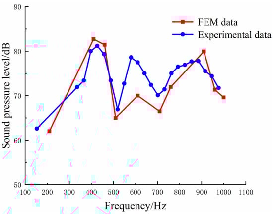To reduce the interference of external structural vibration on the noise test system, the noise data of the straight outlet conduit of the vertical axial-flow pump device were collected at the speed of 2200 r/min. The sound pressure level at the inlet point of the straight outlet conduit calculated by FEM was compared with the test data, and the results are shown in Figure 10. The overall rising and falling trend of the sound pressure level at the inlet of the straight outlet conduit calculated by FEM was basically consistent with the data obtained from the test. The maximum difference between the sound pressure level calculated by FEM and the sound pressure level obtained from the test data was 8.2 dB, and the overall trend of the sound pressure level was basically consistent with the test data, therefore, FEM can provide a more accurate sound prediction for the inlet and outlet conduit of the pump device in this paper.
