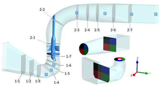 We divided the elbow inlet conduit along the flow direction, corresponding to 7 sections from 1-1 to 1-7 in Figure 11, the straight outlet conduit was divided along the flow direction from the elbow section, corresponding to 7 sections from 2-1 to 2-7 in Figure 11. At the same time, in order to facilitate the comparison of partial velocity changes in the flow conduit, each section was divided into four flow areas: top left, bottom left, top right, and bottom right according to the liquid flow direction in the pump device. To study the sound field characteristics in the conduit, refer to the research ideas in references [12,18]. Four monitoring points were arranged in the elbow inlet conduit and the straight outlet conduit respectively to collect the noise signals, and the positions of each monitoring point are shown in Figure 11, the positive direction of XYZ coordinate axis is shown in the coordinate system in Figure 11.