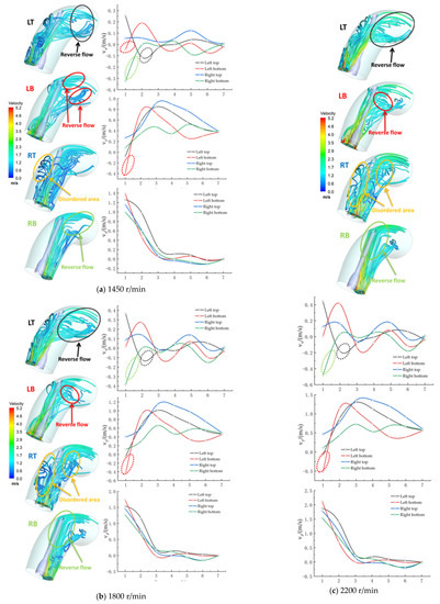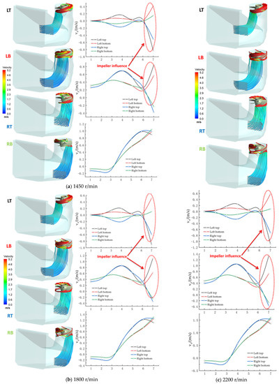 Based on the coordinates in Figure 11, the X-axis direction is defined as the horizontal positive direction, the Y-axis direction as the longitudinal positive direction, and the Z-axis direction as the axial positive direction. At different rotation speeds, the distribution of flow lines in the elbow inlet conduit in the four areas was relatively smooth, and there was no obvious unstable flow. At the same time, the increase and decrease of flow velocities in different directions in the four areas were relatively consistent, so the flow pattern in the elbow inlet conduit is good. With the increase of rotation speed, the water flow in the elbow inlet conduit increased in different directions, but the increase of rotation speed did not affect the flow pattern. Under the action of impeller rotation, the water flow in the LT region bent upward along the side wall of the elbow section of the elbow inlet conduit. It can be seen from Figure 13 that the increase and decrease in the transverse velocity of the water flow in the four areas of the straight outlet conduit were not consistent, the change range of the transverse velocity of the water flow in the left half region exceeded that in the right half region. When the rotation speed increased from 1450 r/min to 2200 r/min, the transverse velocity of the water flow in the LT region of the straight outlet conduit increased from 0.267 m/s to −0.146 m/s, 0.379 m/s to −0.156 m/s, and 0.442 m/s to −0.22 m/s respectively. The horizontal velocity of the water flow in the LB region rose from −0.40 m/s to 0.86 m/s, −0.42 m/s to 1.08 m/s, and −0.62 m/s to 1.31 m/s, respectively, indicating that the inconsistent growth of the horizontal velocity of the water flow in the left half of the straight outlet conduit is an important cause of the flow pattern disorder, and the increase of the rotation speed will aggravate the flow pattern disorder.