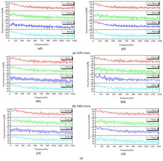 Frequency response curve of sound-pressure level in the inlet and outlet conduits at different rotation speeds. (a) 1450 r/min. (b) 1800 r/min. (c) 2200 r/min. (a1) Sound pressure level of the inlet conduit. (a2) Sound pressure level of outlet conduit. (b1) Sound pressure level of the inlet conduit. (b2) Sound pressure level of outlet conduit. (c1) Sound pressure level of the inlet conduit. (c2) Sound pressure level of outlet conduit.