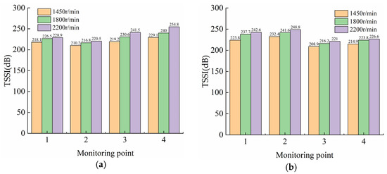 Through the analysis of TSSI at different monitoring points in the inlet and outlet conduits at different rotation speeds, as shown in Figure 15, it can be seen that the TSSI in the inlet and outlet conduits of the vertical axial-flow pump at different rotation speeds did not meet the change law of the pump’s similarity law, that is, the sound field in the conduit did not meet the change law of the pump’s similarity law. In this paper, the flow condition of the axial-flow pump device was the low flow rate condition (0.6Qbep), and the velocity distribution at the outlet of the inlet conduit were affected by the impeller rotation under the low flow rate condition [25], and the outlet flow field of the elbow inlet conduit was different. The internal flow field of the outlet conduit was not similar under the influence of the impellers at different rotation speeds, there were obvious differences in the residual velocity circulation at the outlet of the guide vane of the axial-flow pump at different rotation speeds. The internal flow field of the outlet conduit presented a spiral flow pattern with different rotational strengths [26]. This paper analyzed the TSSI of different monitoring points in the inlet and outlet conduits at different rotation speeds, as shown in Figure 15, the TSSI in the inlet and outlet conduit of the vertical axial-flow pump at different rotation speed did not meet the change law of the pump’s similarity law, that is, the sound field in the conduit did not meet the change law of the pump’s similarity law. Although the sound field in the conduit is mainly affected by the rotation of the impeller, other factors also have certain effects on the hydraulic noise, the vortex of different scales will also affect the velocity field, so the velocity field of the conduit at different rotation speeds was not similar. By comparing Figure 15a,b, it can be seen that, as the main noise source, the sound source of the impeller propagated upstream and downstream along the conduit. With the increase of distance, TSSI showed a trend of attenuation, when the rotation speed increased from 1450 r/min to 2200 r/min, the TSSI attenuation from monitoring point 4 to monitoring point 1 in the elbow inlet conduit was 11.0 dB, 13.5 dB, and 25.9 dB respectively, and the TSSI attenuation from monitoring point 1 to monitoring point 4 in the straight outlet conduit was 8.9 dB, 13.9 dB, and 16.0 dB respectively, indicating that the higher the rotation speed, the faster the noise attenuation in the process of internal propagation in the inlet and outlet conduit. The impeller is the main hydraulic noise source inside the axial-flow pump device, the distance between different monitoring points and the impeller in the conduit is different, and the hydraulic noise at different monitoring points is also affected by the impeller. As shown in Figure 15, the farther the monitoring point is from the impeller, the smaller the difference between the TSSI values at different rotation speeds, and the closer the monitoring point is to the impeller, the greater the impact of the impeller. The difference between the TSSI values of the monitoring points closest to the impeller in the conduit at different rotation speeds will increase with the increase of the speed, therefore, the greater the rotation speed, the faster the noise source attenuates in the inlet and outlet conduits. The attenuation of noise in the elbow inlet conduit was greater than that in the straight outlet conduit, and there was a large number of vortex junctions in the straight outlet conduit, which induced flow noise and promoted the propagation of noise. At the same time, since the monitoring point 2 in the straight outlet conduit was located in the structural transition section, the velocity change amplitude of water flow in the structural transition section increased fast along the three directions, and the impact and friction of the water flow on the conduit wall induced the flow noise, therefore, the TSSI of the straight outlet conduit at monitoring point 2 increased significantly, and then decreased twice.