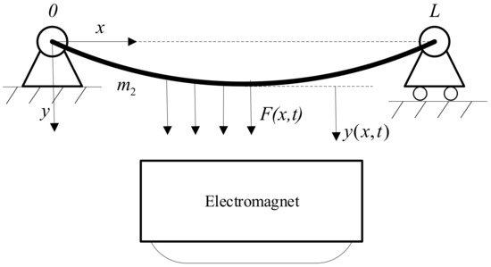 Since the dimensions of the maglev girder cross-section are far smaller than the length of the girder, the track beam is simplified as a flexible Bernoulli–Euler beam. Figure 2 shows the simplified model of the vehicle–guideway coupled system. F is the electromagnetic force acting on the track beam, and L and m2 are the length and mass of the track beam, respectively. Only the vertical motion of the track is considered, and the motion equation of the track is given by: