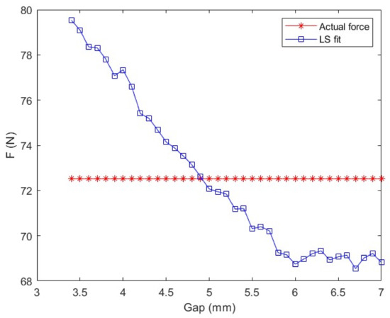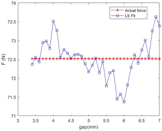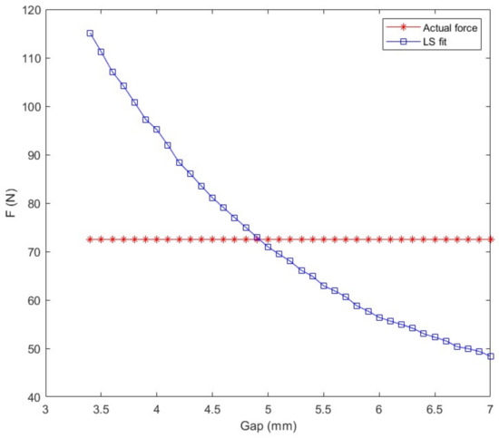 Table 1 gives the relevant parameters of the experimental platform. Figure 3 shows the electromagnetic forces obtained from the experiments, and as a comparison, the electromagnetic forces estimated by the empirical formula are also plotted in the same figure. It can clearly be seen that there were obvious errors between the electromagnetic forces estimated by the empirical formula, and the real electromagnetic forces; the estimated electromagnetic force increased significantly as the gap increased, while the actual electromagnetic force remained the same (which equaled the weight of the suspension load). In this section of the paper, several possible LS fit formulas are proposed, to find the best electromagnetic force estimation model.