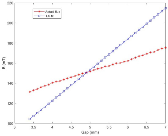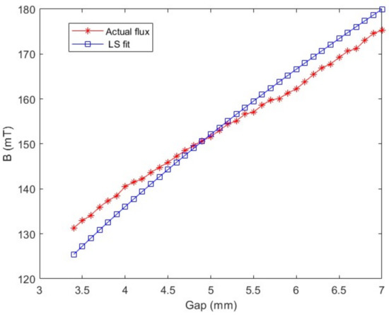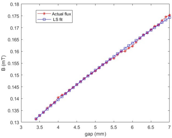 Substituting Equation (17) into Equation (18), then k = 0.077141 is obtained. Figure 4 shows the relationship between the electromagnetic force estimated by the LF fit, the actual electromagnetic force and the suspension gap. When the suspension gap was 3.5 mm, the electromagnetic force error reached 58.76%, which was much larger than the empirical formula. It can be seen that the fitting formula was far from meeting the requirements for accuracy, and a comparison between calculated results of the magnetic fluxes given in Figure 5, and the actual values, also supports this conclusion. Note that after the introduction of δ2, the estimated value of the electromagnetic force changed from an increase with the increase in the gap, to a decrease with the increase in the gap; that is to say, the contribution of δ to the electromagnetic force was a little too large at this time. Therefore, a new fitting model was proposed.
