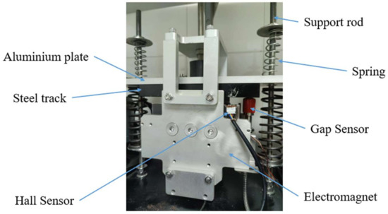 In order to verify the control effect of the algorithm proposed above, the control algorithm was tested on a vehicle–guideway coupled vibration experimental platform. Figure 11 shows the structure diagram of the experimental platform, which consisted of a suspension electromagnet, a suspension track, sensors, support rods, support springs, control boxes, and a power supply, etc. The support rod was fixed in the vertical direction, and the upper and lower springs were fixed along the support rods, supporting the aluminum plate and the guideway. There was a groove at the upper surface of the iron core of the electromagnet, and a Hall sensor was placed in this groove to measure the magnetic flux density in the air gap; a gap sensor and an accelerometer were also fixed on the electromagnet. Some relevant parameters of the experimental platform are given in Table 2.