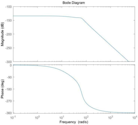 The track was first fixed with rigid constraints to test whether the control algorithm could achieve suspension on a rigid track. The control parameters were: , , , and , which satisfied the requirements of Equation (45). The poles of the system were , , , and . Figure 14 shows the Bode diagram of the system. As expected, the gain of the system in the low frequency band was about −134 dB, which satisfied the requirement of low gain. The phase shift of the system in the low frequency band was very small, which further proved the good stability of the system. Figure 15 shows the effect of the control scheme proposed in this paper. The actual and expected magnetic flux, the suspension gap, and the vertical track velocity are plotted, respectively.