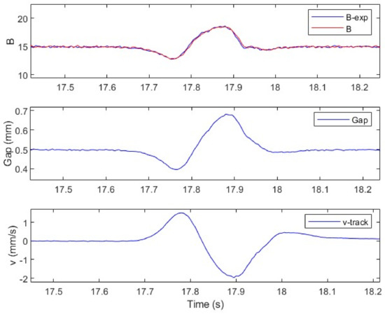 For the experimental platform, the stiffness of the track without constraint completely depended on the stiffness of the springs, which were quite low compared with the weight of the suspension load. In this case, the system was prone to the problem of vehicle–guideway coupling vibration, so the stability of the control algorithm under low stiffness could be effectively verified. Figure 16 shows the actual magnetic flux, the expected magnetic flux, the suspension gap, and the vertical track velocity in the process of suspension. It can be seen that, although supported by low-stiffness springs, the suspension gap still quickly followed the desired gap with no overshoot and no steady-state error. Affected by disturbance of the electromagnetic force, the track suffered a downward speed and then quickly decelerated to zero, which showed that the coupling vibration never occurred. The experimental results proved that the algorithm had excellent control performance.