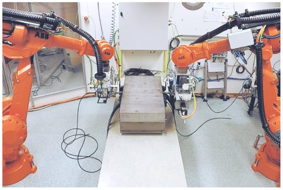 A common robot cell design with two winding robots and one cable preparation robot was developed and simulated for the two smaller rotating machines S2a–b; see Figure 10. ABB IRB 4600 industrial robots with 2.05 m reach and 60 kg payload capacity were used both as winding robots and for the cable preparation. The complete cell floor dimensions were 3.5 × 6.0 m. A conveyor enabled a smooth workflow with stator transportation through the cell. A smaller fence opening allowed cable drum replacement from the outside. The complete robot cell investment cost, including installation and commissioning, was estimated to about 300,000 EUR. To increase the productivity, the robot cell could be equipped with two winding robot pairs, winding one stator each simultaneously. This extended cell would be about 5.0 × 6.5 m, and the investment cost was estimated to about 450,000 EUR. It was estimated that one operator could both supervise the robot cell and perform the following manual winding cables connection assembly step. The average electric power consumption of the robot cell was roughly estimated to be 10 kW and the maintenance cost to be 35,000 EUR/year.