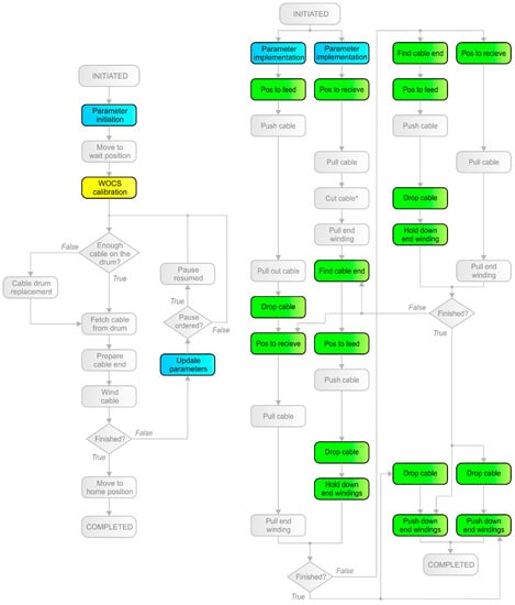 Detailed illustrations of the PLC (left) and robot controller (right) processes for robotized stator cable winding, with the sub-procedures most critical to adjust to adapt to rotating machines highlighted. Original figures are from [27].